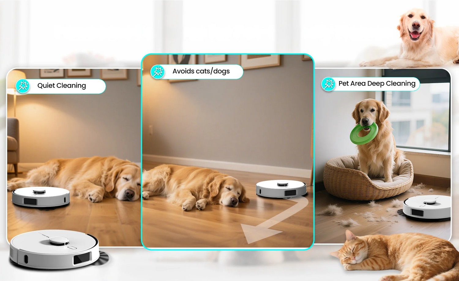 Ja, de är utvecklade just för det! Med stark sugkraft, trasselfria borstar och smart zonstädning runt matskålar och husdjursbäddar tar de enkelt hand om päls och allergener. Du får ett hem som alltid är fräscht och hårfritt.
